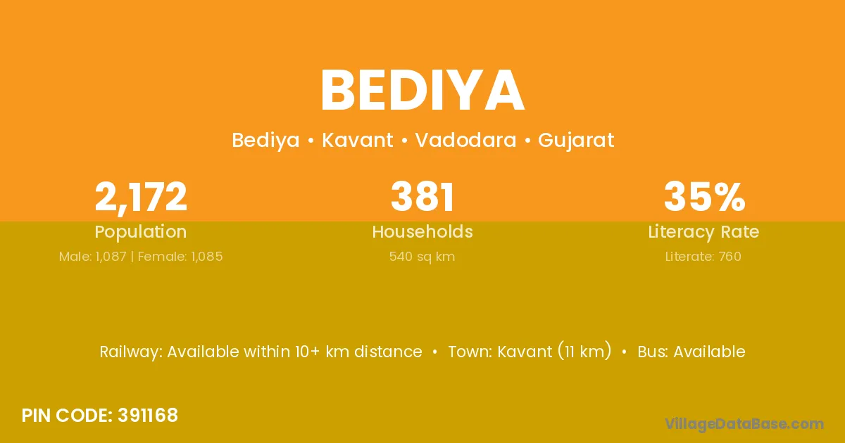 Sanawad (17 km) is the nearest town to Bediya village for major economic activities and is located approximately 17 km away.