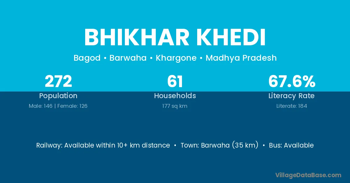 Barwaha (35 km) is the nearest town to Bhikhar Khedi village for major economic activities and is located approximately 35 km away.