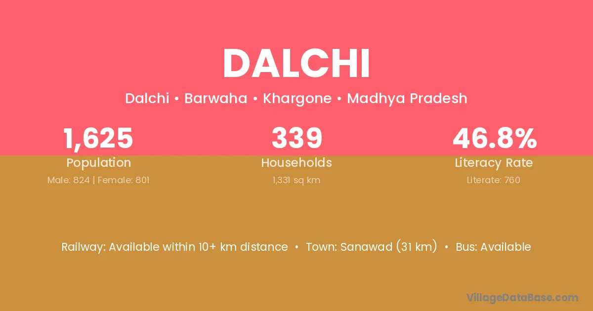 Sanawad (31 km) is the nearest town to Dalchi village for major economic activities and is located approximately 31 km away.