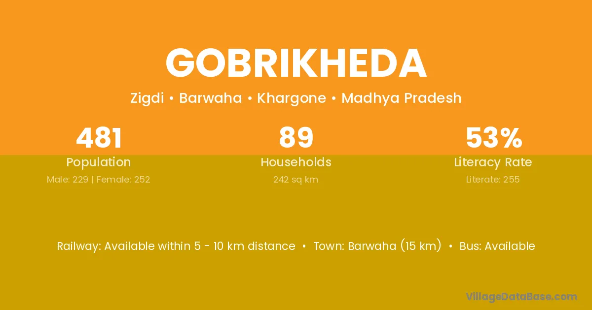 Gobrikheda village has a total population of 481 people, of which 229 are males and 252 are females.