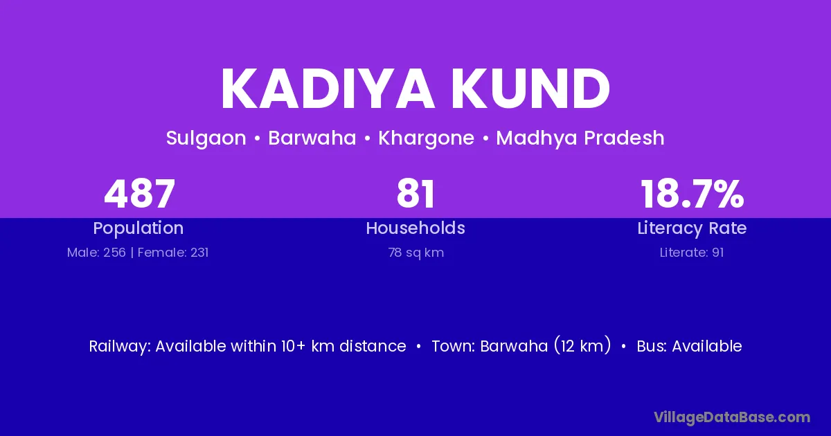 Kadiya Kund village has a total population of 487 people, of which 256 are males and 231 are females.