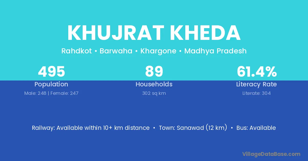 Khujrat Kheda village has a total population of 495 people, of which 248 are males and 247 are females.