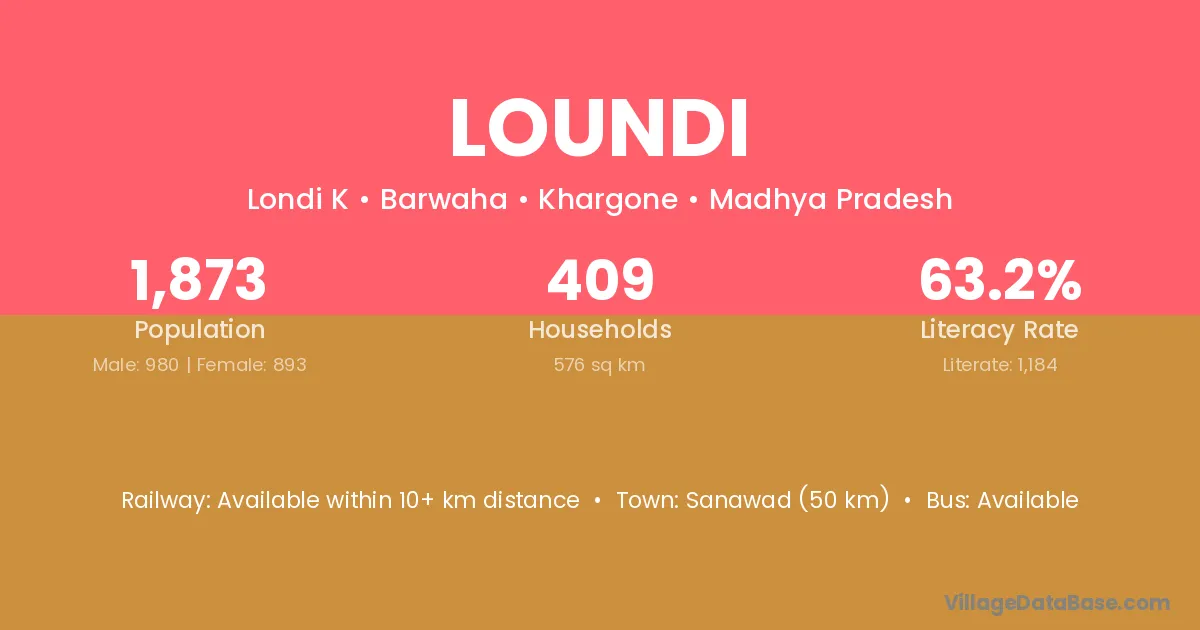 Sanawad (50 km) is the nearest town to Loundi village for major economic activities and is located approximately 50 km away.