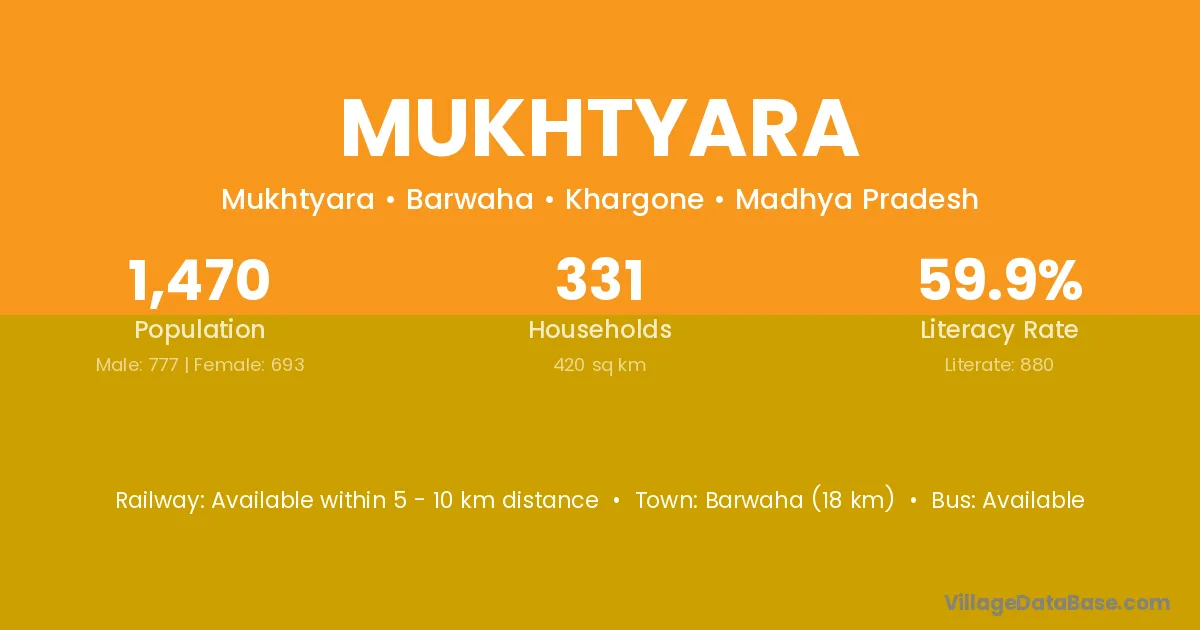 Barwaha (18 km) is the nearest town to Mukhtyara village for major economic activities and is located approximately 18 km away.