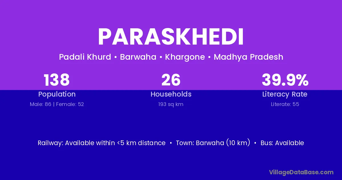 Barwaha (10 km) is the nearest town to Paraskhedi village for major economic activities and is located approximately 10 km away.
