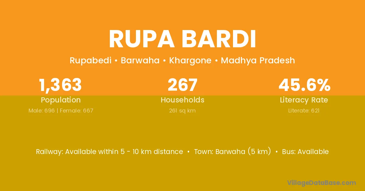 Barwaha (5 km) is the nearest town to Rupa Bardi village for major economic activities and is located approximately 5 km away.
