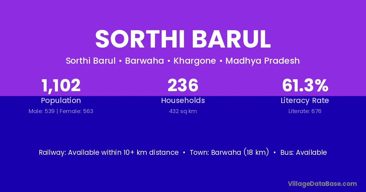 Barwaha (18 km) is the nearest town to Sorthi Barul village for major economic activities and is located approximately 18 km away.