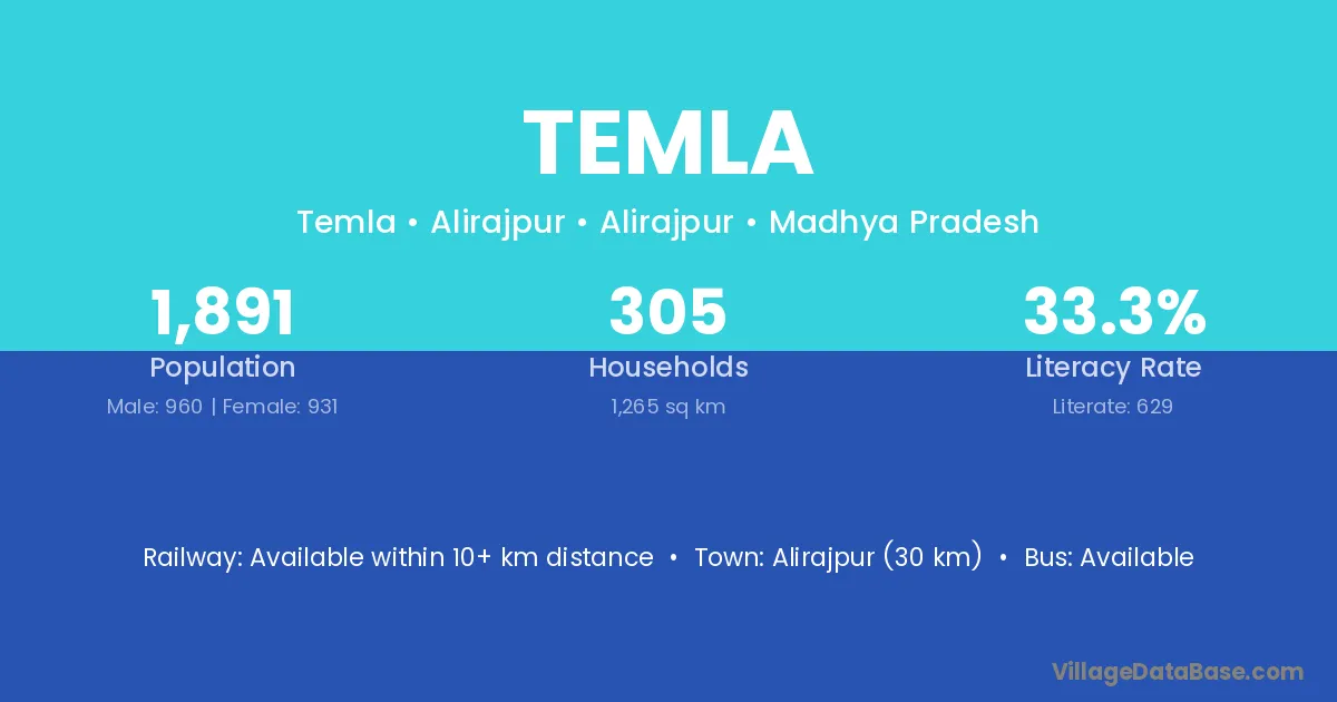 Barwaha (30 km) is the nearest town to Temla village for major economic activities and is located approximately 30 km away.