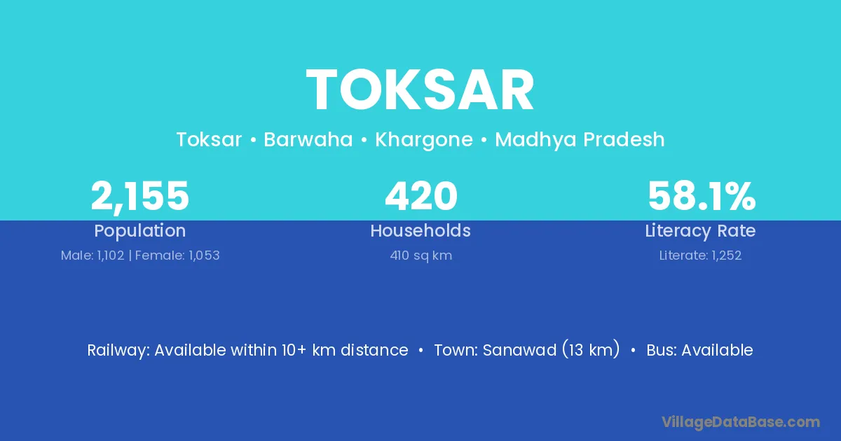 Sanawad (13 km) is the nearest town to Toksar village for major economic activities and is located approximately 13 km away.