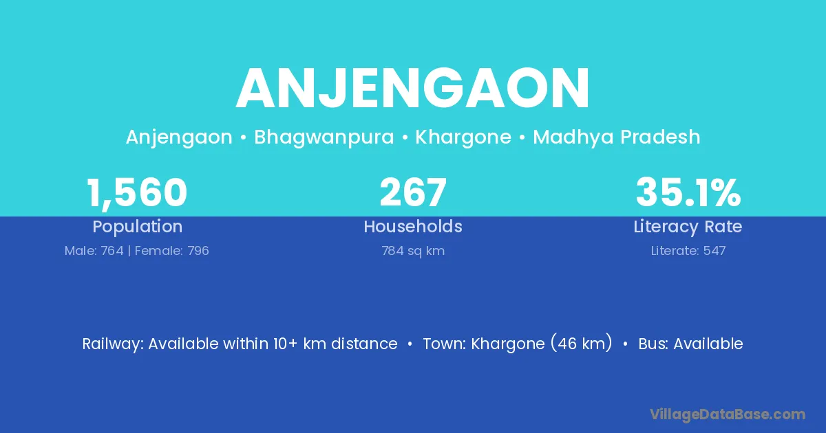 Khargone (46 km) is the nearest town to Anjengaon village for major economic activities and is located approximately 46 km away.