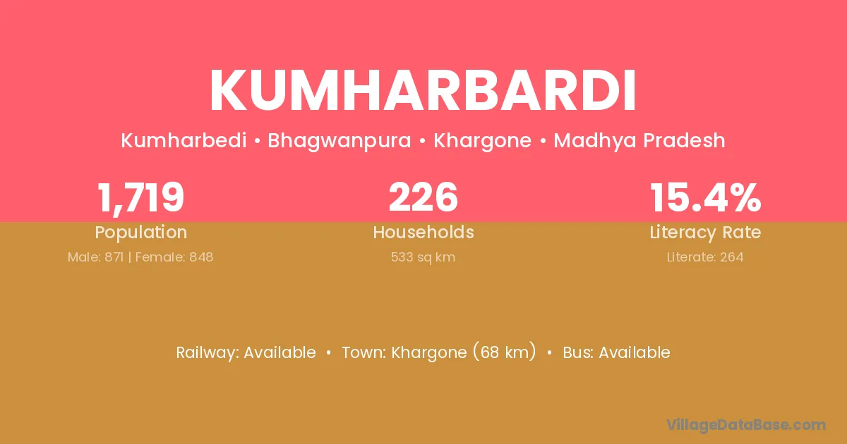 Khargone (68 km) is the nearest town to Kumharbardi village for major economic activities and is located approximately 68 km away.