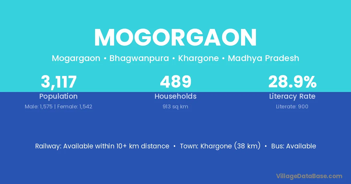 Khargone (38 km) is the nearest town to Mogorgaon village for major economic activities and is located approximately 38 km away.
