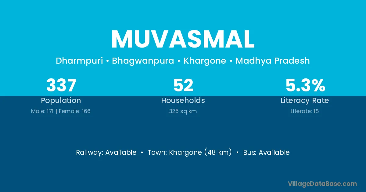 Khargone (48 km) is the nearest town to Muvasmal village for major economic activities and is located approximately 48 km away.