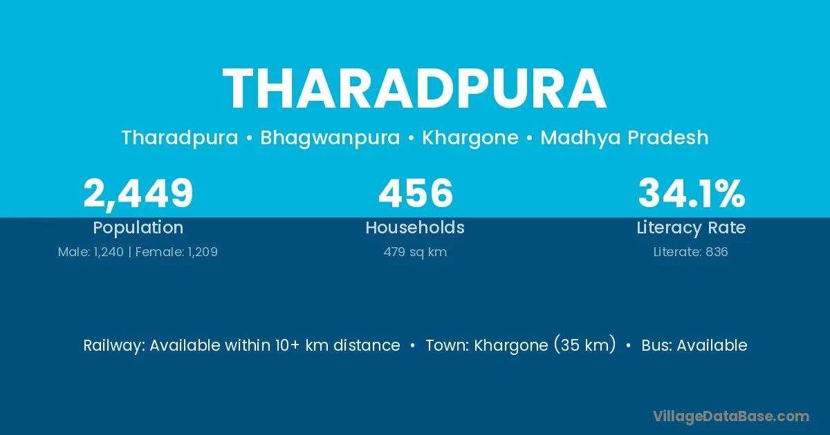 Khargone (35 km) is the nearest town to Tharadpura village for major economic activities and is located approximately 35 km away.