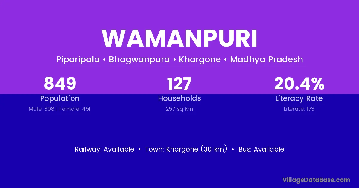 Khargone (30 km) is the nearest town to Wamanpuri village for major economic activities and is located approximately 30 km away.