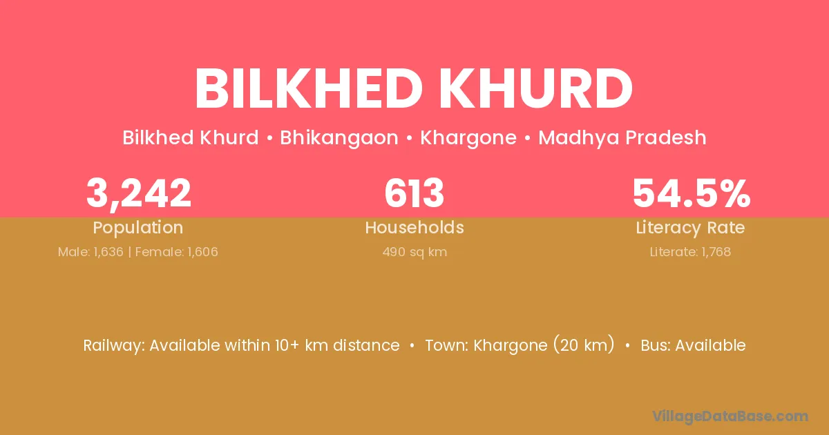 Khargone (20 km) is the nearest town to Bilkhed Khurd village for major economic activities and is located approximately 20 km away.