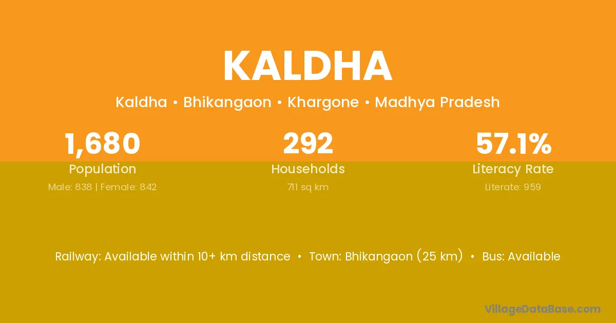 Bhikangaon (25 km) is the nearest town to Kaldha village for major economic activities and is located approximately 25 km away.