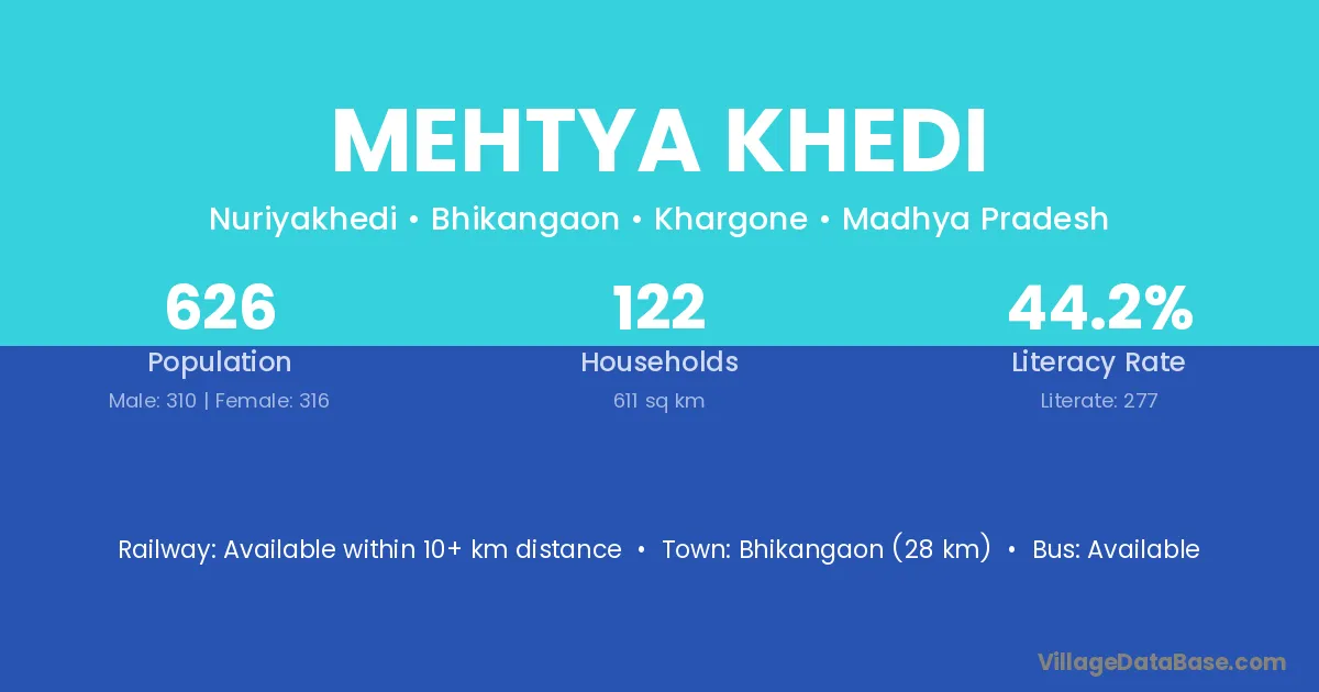 Bhikangaon (28 km) is the nearest town to Mehtya Khedi village for major economic activities and is located approximately 28 km away.