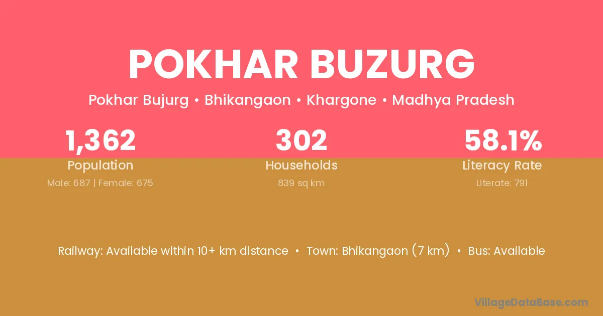 Bhikangaon (7 km) is the nearest town to Pokhar Buzurg village for major economic activities and is located approximately 7 km away.