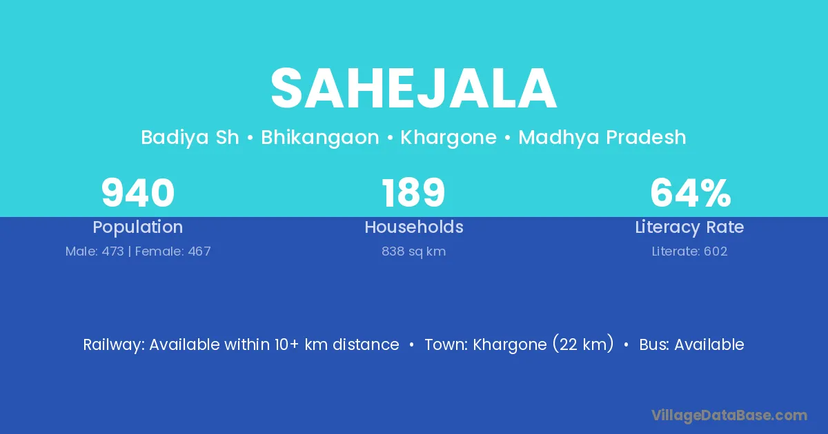 Khargone (22 km) is the nearest town to Sahejala village for major economic activities and is located approximately 22 km away.