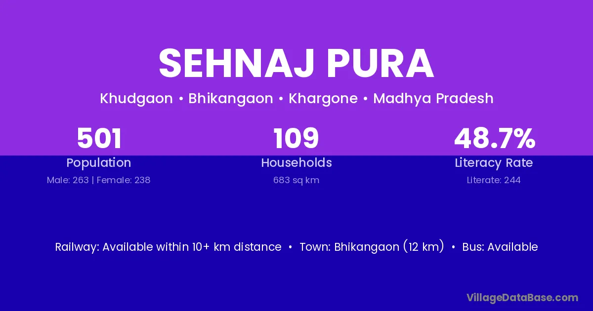Bhikangaon (12 km) is the nearest town to Sehnaj Pura village for major economic activities and is located approximately 12 km away.