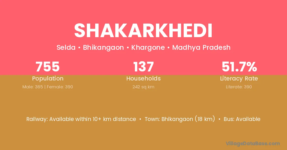 Bhikangaon (18 km) is the nearest town to Shakarkhedi village for major economic activities and is located approximately 18 km away.