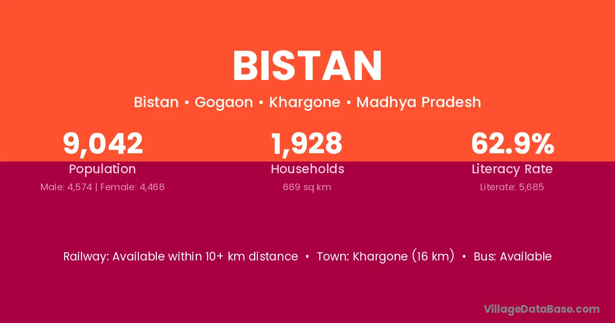 Khargone (16 km) is the nearest town to Bistan village for major economic activities and is located approximately 16 km away.