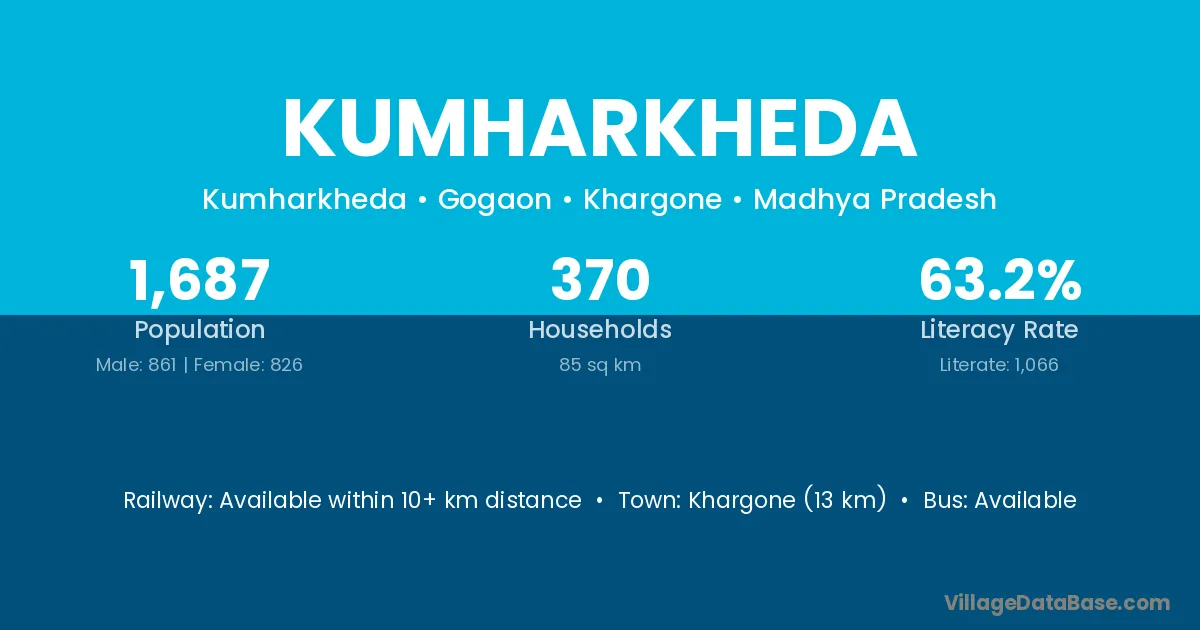 Khargone (13 km) is the nearest town to Kumharkheda village for major economic activities and is located approximately 13 km away.