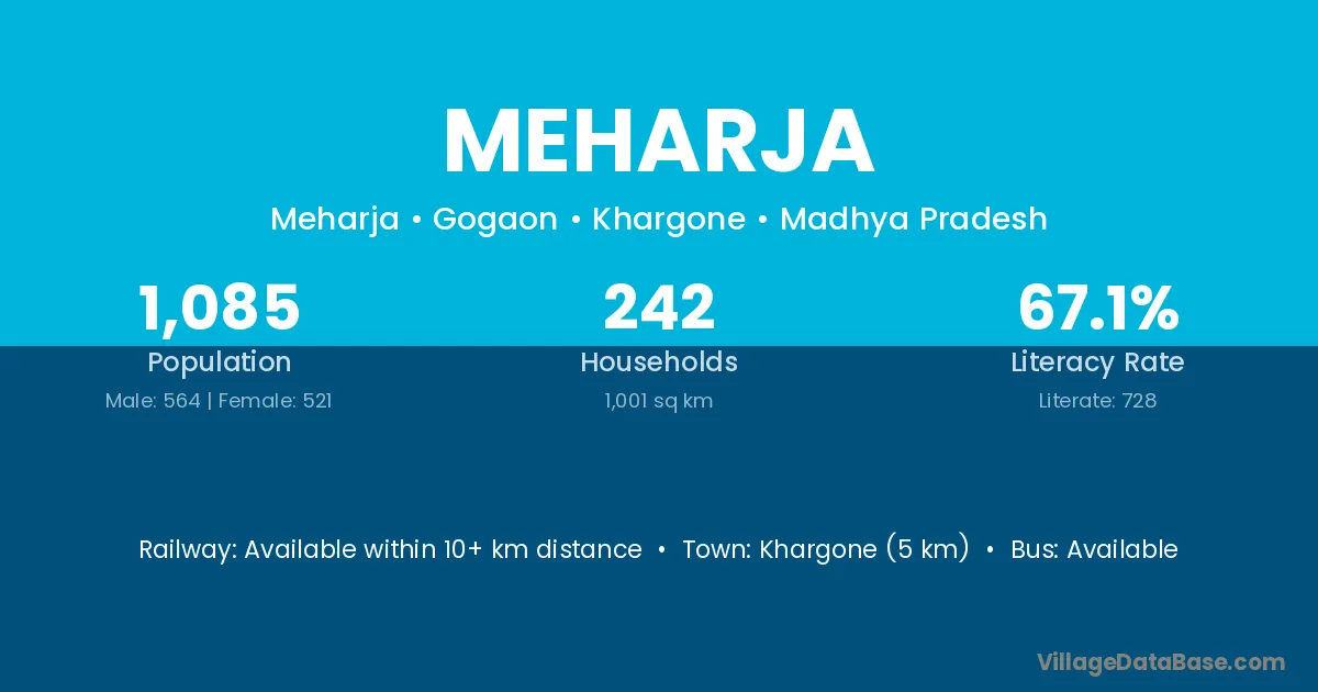 Khargone (5 km) is the nearest town to Meharja village for major economic activities and is located approximately 5 km away.