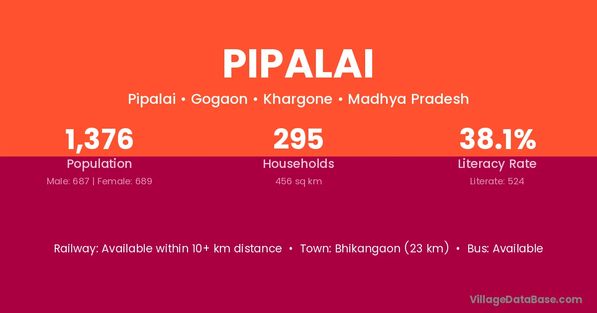 Bhikangaon (23 km) is the nearest town to Pipalai village for major economic activities and is located approximately 23 km away.