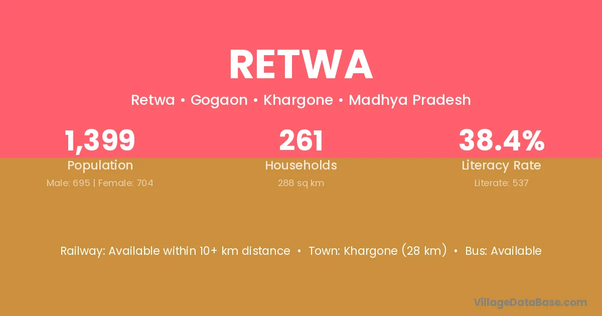 Khargone (28 km) is the nearest town to Retwa village for major economic activities and is located approximately 28 km away.