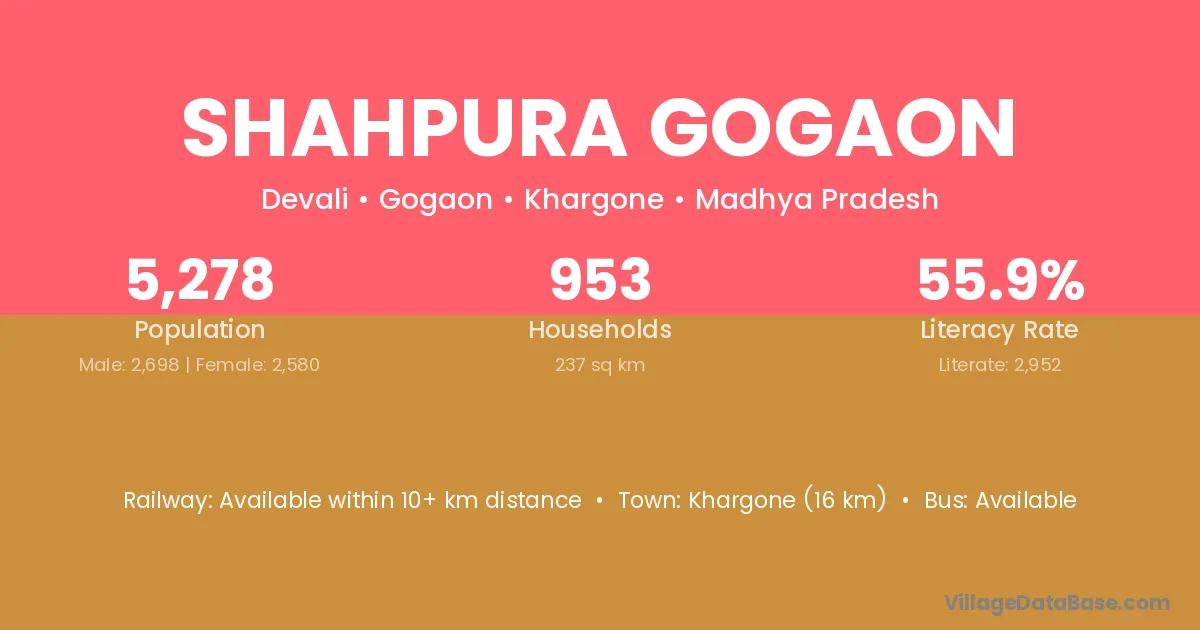 Khargone (16 km) is the nearest town to Shahpura Gogaon village for major economic activities and is located approximately 16 km away.
