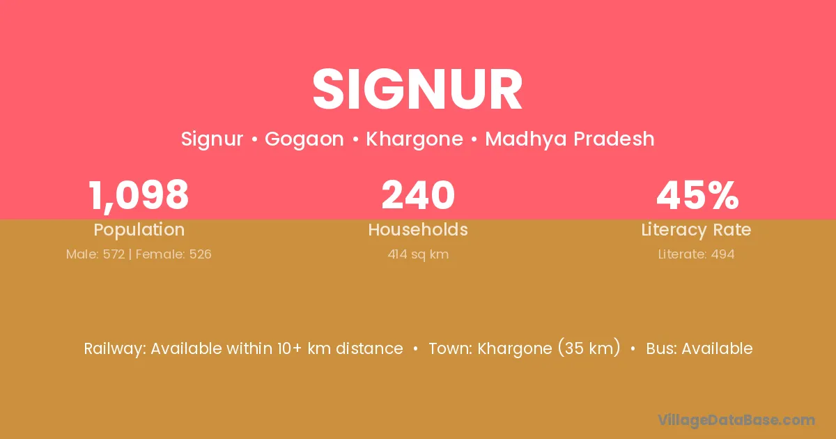 Khargone (35 km) is the nearest town to Signur village for major economic activities and is located approximately 35 km away.