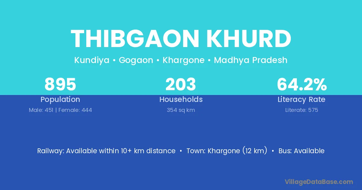 Thibgaon Khurd village has a total population of 895 people, of which 451 are males and 444 are females.