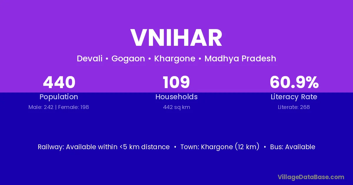 Khargone (12 km) is the nearest town to Vnihar village for major economic activities and is located approximately 12 km away.