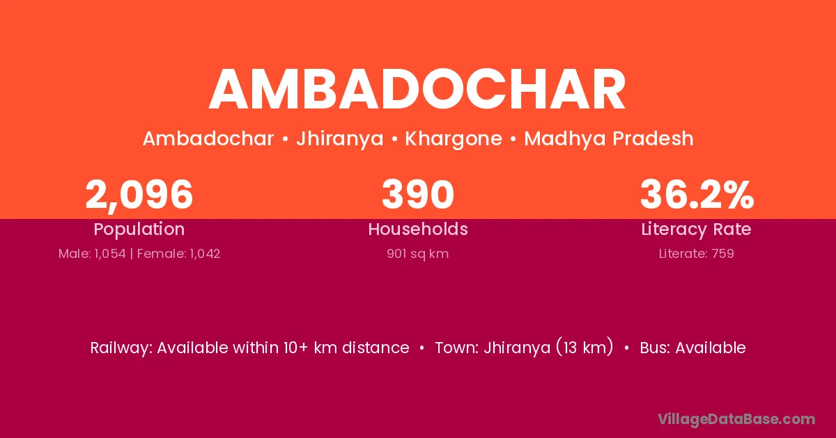 Jhiranya (13 km) is the nearest town to Ambadochar village for major economic activities and is located approximately 13 km away.