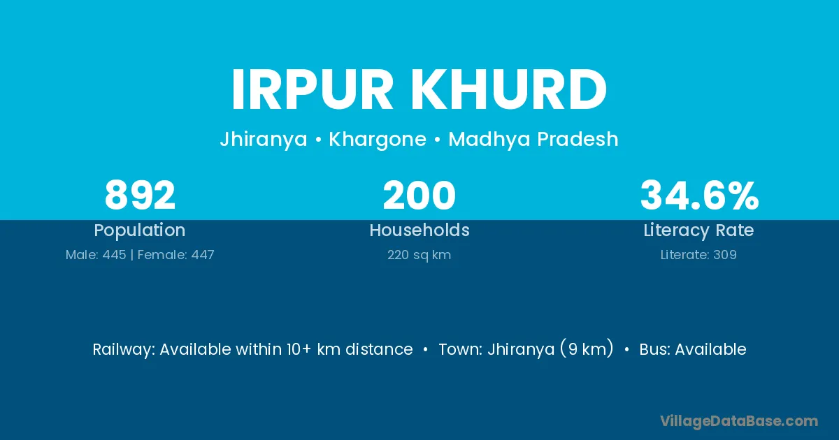 Jhiranya (9 km) is the nearest town to Irpur Khurd village for major economic activities and is located approximately 9 km away.