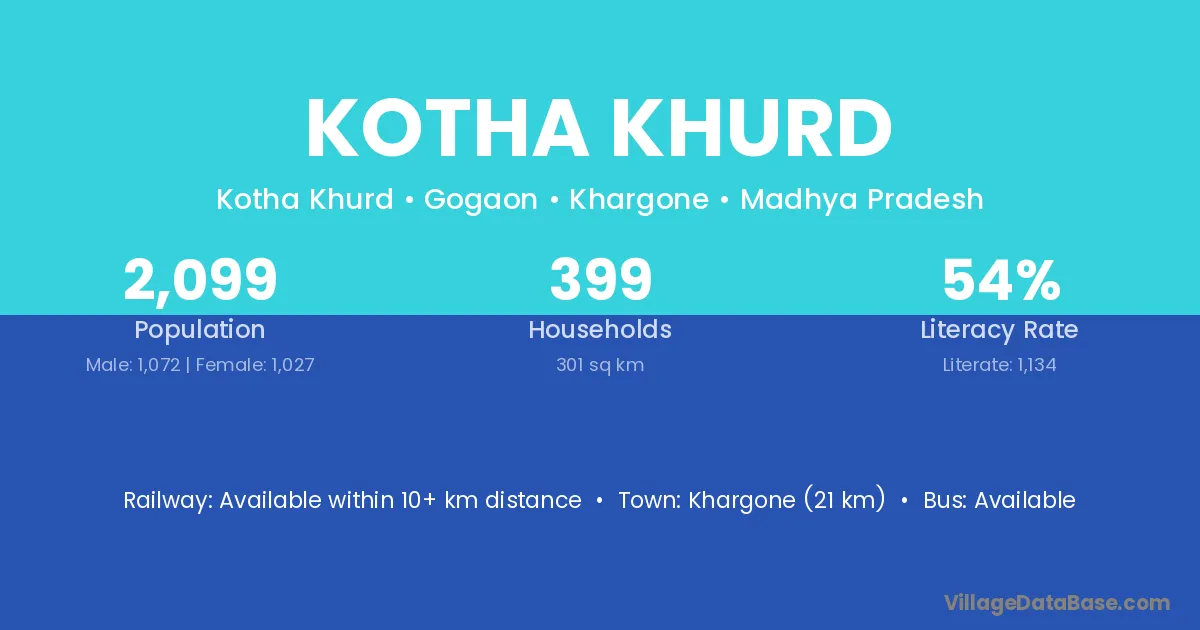 Kotha Khurd village has a total population of 857 people, of which 431 are males and 426 are females.