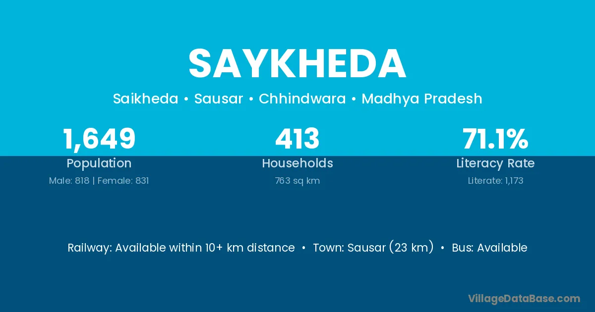 The literacy rate of Saykheda village is 46.42%. Male literacy stands at 55.47% and female literacy at 37.23%.