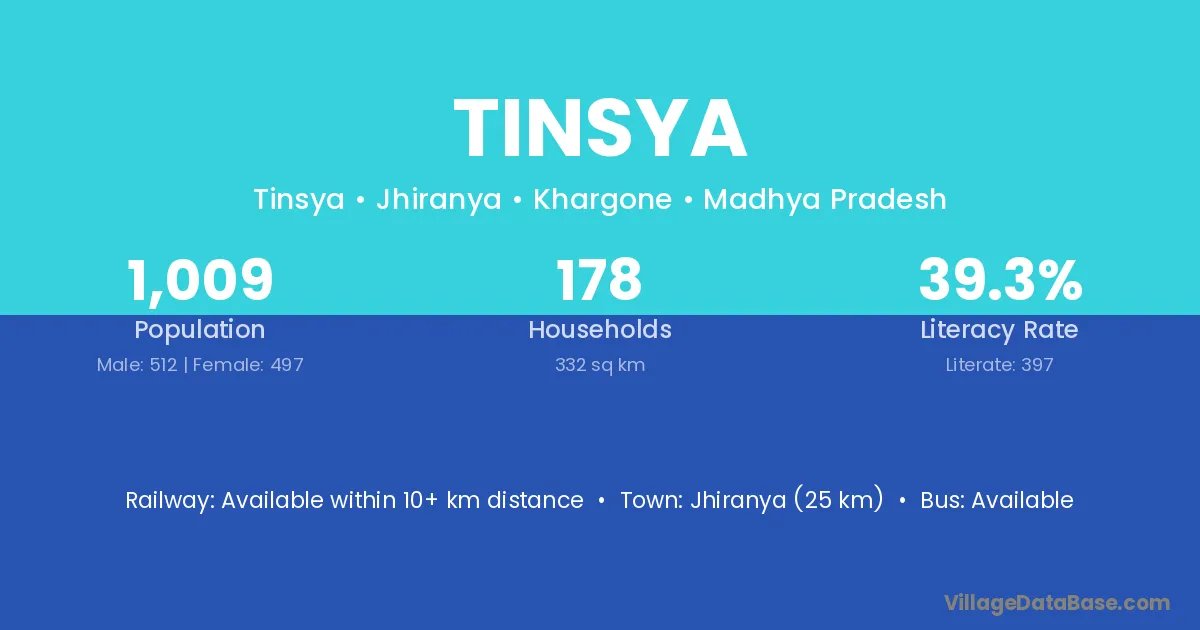 Tinsya village has a total population of 1,009 people, of which 512 are males and 497 are females.
