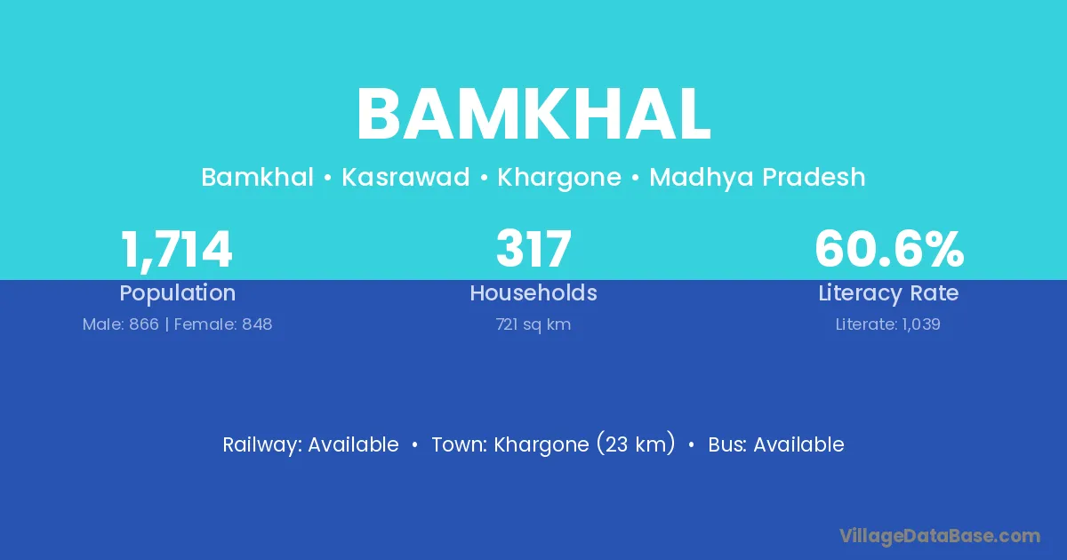 Khargone (23 km) is the nearest town to Bamkhal village for major economic activities and is located approximately 23 km away.