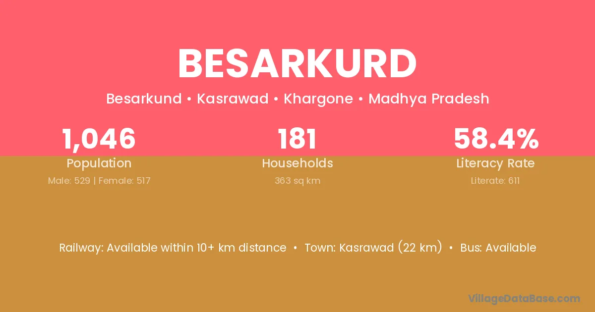 Kasrawad (22 km) is the nearest town to Besarkurd village for major economic activities and is located approximately 22 km away.
