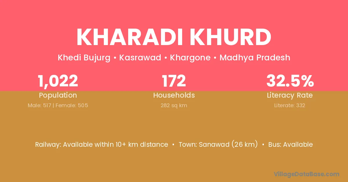 Sanawad (26 km) is the nearest town to Kharadi Khurd village for major economic activities and is located approximately 26 km away.