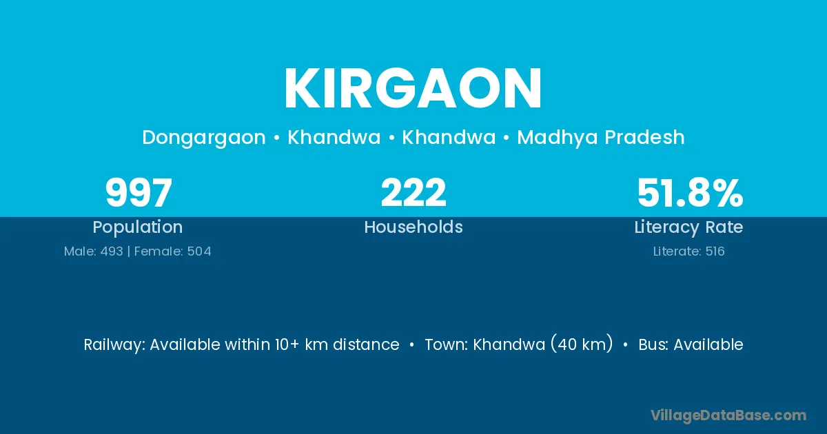 Kasrawad (50 km) is the nearest town to Kirgaon village for major economic activities and is located approximately 50 km away.