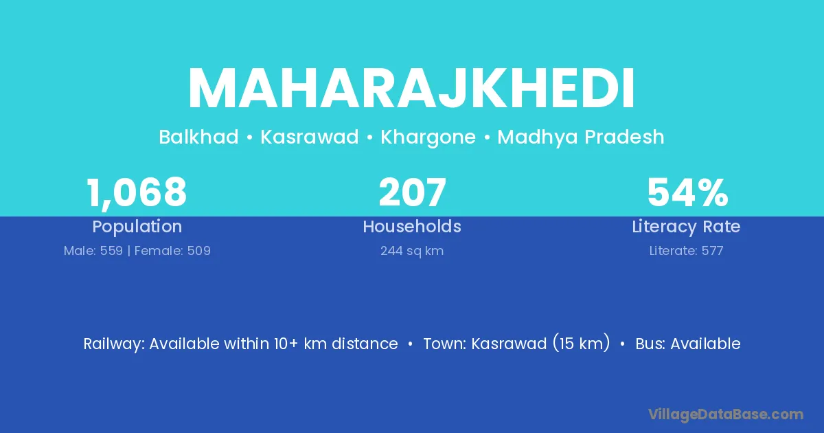 Kasrawad (15 km) is the nearest town to Maharajkhedi village for major economic activities and is located approximately 15 km away.