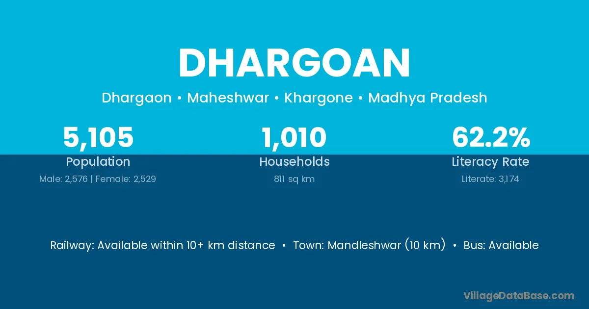 Mandleshwar (10 km) is the nearest town to Dhargoan village for major economic activities and is located approximately 10 km away.