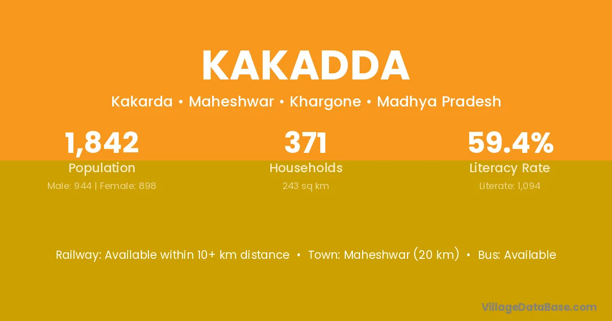 Maheshwar (20 km) is the nearest town to Kakadda village for major economic activities and is located approximately 20 km away.