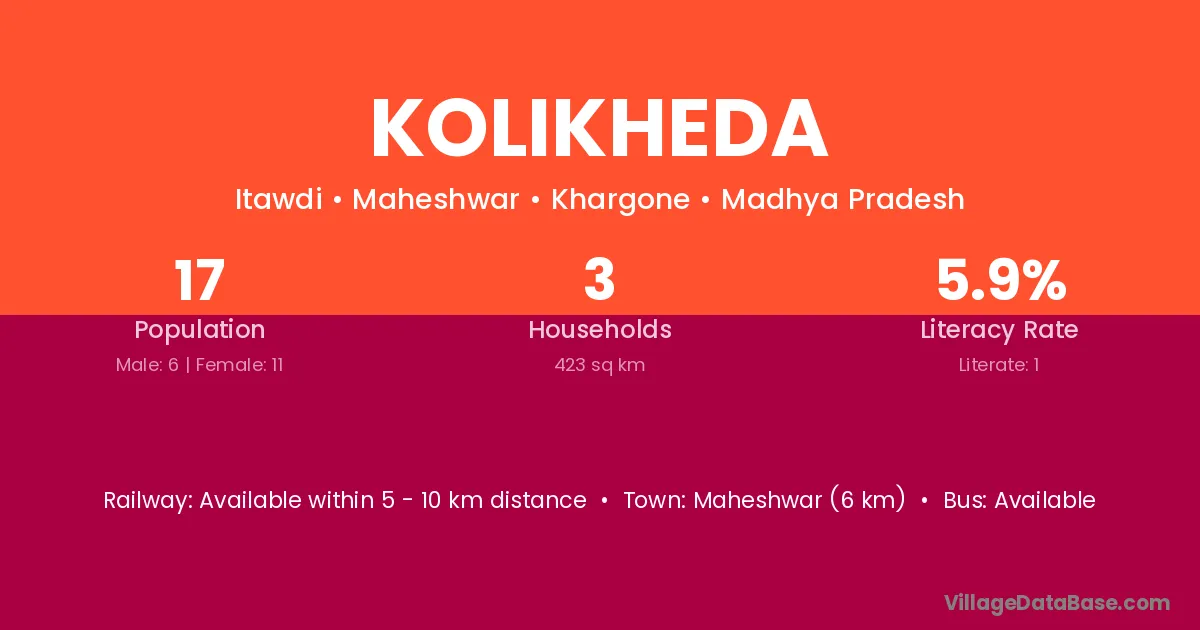 Maheshwar (6 km) is the nearest town to Kolikheda village for major economic activities and is located approximately 6 km away.