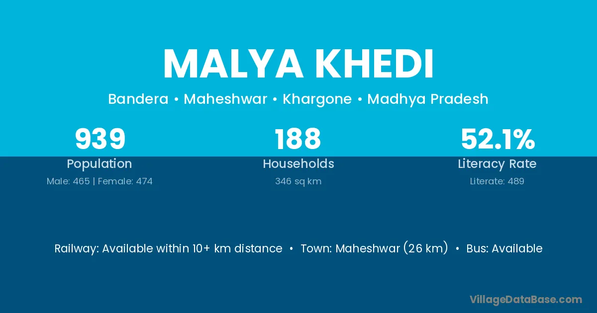 Maheshwar (26 km) is the nearest town to Malya Khedi village for major economic activities and is located approximately 26 km away.