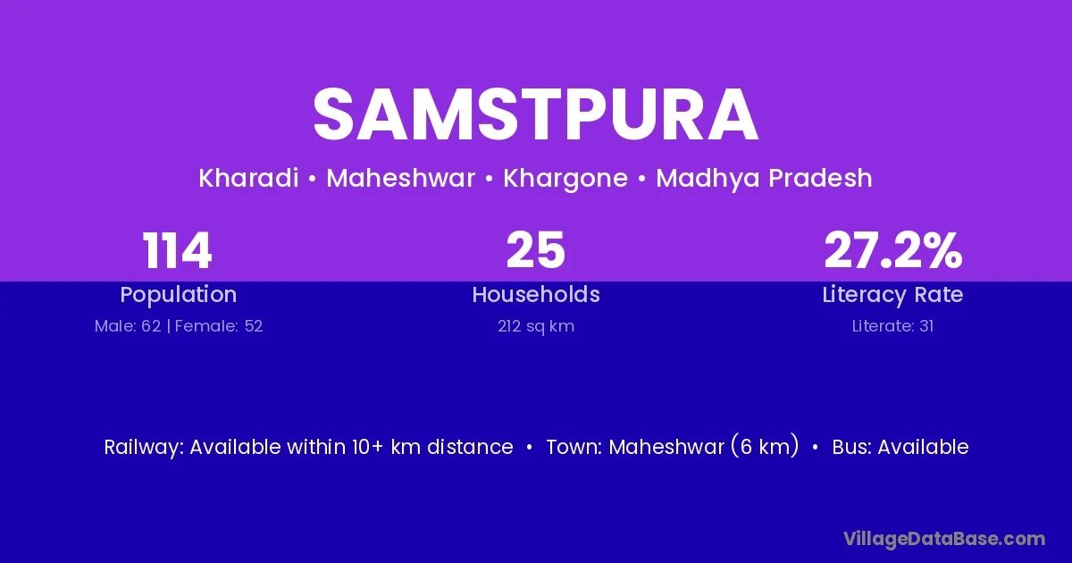 Maheshwar (6 km) is the nearest town to Samstpura village for major economic activities and is located approximately 6 km away.